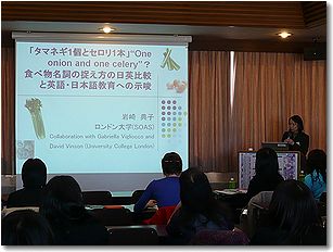 日本語学部会は、国際日本学コンソーシアムの第1日目、12月15日(月)の12時30分から16時30分にかけて、人間文化創成科学研究科棟6階大会議室、5階SCS室にて行われた。 今回の国際日本学コンソーシアムは、「食・もてなし・家族」をテーマとし、日本語学部会でも各自が多彩な研究発表を行った。 当部会は、第一部と第二部と交流の時間に分けられていた。まず、海外の大学からお招きした教員による講演があり、続けて院生が研究発表をする形をとった。 第一部は、英国・ロンドン大学SOASの岩﨑典子先生による、「タマネギ1個とセロリ1本“One onion and one celery”?-食べ物名詞の捉え方の日英比較と英語・日本語教育への示唆」という演題の御講演で幕を開いた。先生は、加算・付加算の文法的区別の存在(英語)と不在(日本語)が、英語母語話者、日本語母語話者の食べ物名詞の捉え方に影響するかどうかを調査された結果、食べ物名詞の捉え方には両者に有意差がなかったという報告をまず述べられ、それなのになぜ、英語の加算・不加算や日本語の助数詞の習得が難しいのかという問題を提出された。 岩﨑先生ご自身はこれを、「食べ物名」を短絡的に文法項目と直結させて教えている従来の教授活動や、授業が実際に行われている教室内で、文脈や場面の配慮より、文・単語レベルの学習が優先されている結果ではと報告なさった。そして今後の教育活動への示唆として、文脈・場面を考慮した上での加算・不加算や助数詞の選択練習や、それらの選択判断について、プロトタイプ的なものと、そこから連続性をもつものに分けて教えていくことなどを提案された。 続いて、本学大学院生の具軟和さんが、「広告と食-日・韓のコマーシャルからみることばと食-」というタイトルで発表なさった。具さんは、おいしさや味覚をどう捉えて表現するかをコマーシャル媒体から眺め、日韓で比較された。共通点としては、日本も韓国も「おいしい」、「うまい」、「健康」、「自然」という表現が多用されている場合が多いことであり、相違点としては、日本は飲料のコマーシャルが多く、酒類も加えると、飲み物の広告が全広告の4割を占めるのに対し、韓国では飲み物の広告はそれほど多くはなく、特に酒類のコマーシャルは好まれない傾向があること、代わって韓国では加工食品の広告が多くを占め、農産物の広告も日本より見られること、日本が食品の風味を表す表現が多いのに対し、韓国では食品の品質をアピールする傾向が強いこと、コマーシャルに使われている異なり語数、延べ語数ともに韓国よりも少ないことなどであることを示された。 この後、10分ほどの休憩をはさみ、第二部へと移った。 第二部は、英国・ロンドン大学SOAS大学院生の阪口治子さんによる、「日本語学習者からみたジェンダー言語」という題の研究発表から始まった。阪口さんは、日本語学習者のジェンダー認識を明らかにすることを研究目的とされ、日本に留学経験のある日本語学習者を対象に、日本社会でのジェンダーの捉え方、認識しているジェンダー言語の種類、実際のジェンダー言語の使用と自己のジェンダー意識の関係についてなどについて調査を行われた。結果、回答者の大半がジェンダー言語に対しステレオタイプ化したイメージを持ち、実際の言語行動の多様性に関しては深い認識を持っておらず、むしろ中立的な、オーソドックスな日本語を使用していることが分かったと説明された。また学習者の性差だけでなく、年齢が回答に影響を与えてことも見て取れたと述べられた。阪口さんはこれらを踏まえ、日本語教育の現場での言語行動の多様性の意識と記述的情報に基づくジェンダー言語の指導の推進を、また日本語母語話者には、自己が学習者にとって常に文化的・言語的情報源となることを意識した学習者との関わりの促進を提言された。 次に、本学大学院生、藤井禎子さんが、「日本語の歴史の中の位相と性差」というタイトルで発表された。語の位相差は、性差、地域差、階層差などによるものがあるが、中でも藤井さんは性差によるもの、特に女性によって使用された女房詞に着目し、それがどのように一般社会に広まったかを検証された。 次に、本学大学院生、アンナ・チョールナヤさんが、「江戸語の位相と遊里語」という題で発表された。前述の藤井さんの扱った女房詞と並ぶ女性特有の言葉に、主に近世に遊里で遊女やその周辺に使用された遊里語があり、また、同様に男性が専ら使用した言葉として武士詞があるが、チョールナヤさんはそれらを、敬語や人称などの観点からまとめられた。 次に、本学大学院生、イソ・アパコーンさんが、「タイ語の文末辞と日本語の終助詞「わ」:「Kha」と「わ」の対照」というタイトルで発表された。日本語の終助詞「わ」は、女性が主たる使い手である場合が多い終助詞であるとよく整理されるものであるが、イソさんはそれとよく似たタイ語の文末辞である「Kha」に