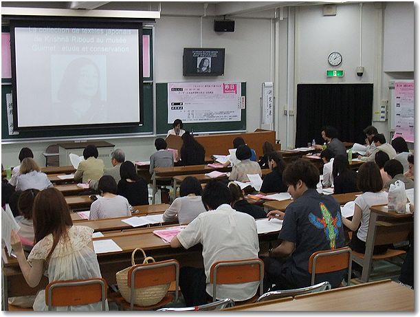 森山新(比較日本学教育研究センター長)より挨拶 ![]() 古瀬奈津子(大学院教育改革支援プログラム)より挨拶 ![]() 司会者:ロール・シュワルツ=アレナレス(本学)より趣旨説明 ![]() ![]() 1.オーレリー サミュエル Aurelie SAMUEL (ギメ美術館) 「ギメ美術館蔵クリシュナ・リブー日本織物コレクション:その研究と保存」 La collection de textiles japonais de Krishna Riboud au Musee Guimet: etude et conservation ![]() ![]() 2. 高木 陽子 TAKAGI Yoko (文化女子大学) 「染型紙とジャポニスム」 Japanese Stencil Plate and Japonisme ![]() ![]() 3. 円谷 智子 TSUMURAYA Satoko (パリ第1大学博士課程) 「メッセージ媒体としての現代スカーフ アクセサリーに映し出された20世紀 -ガリエラ美術館コレクション-」 Contemporary scarves as medium of messages Reflection of the twentieth century in the fashion accessories Collection of Galliera Museum ![]() ![]() 4. 廣瀬 緑 HIROSE Midori (パリ第7大学) 「染織とグローバリゼーション:アンディエンヌ(更紗)からジャポニスムへ」 Textile and Globalization, from chintz to japonism. (※廣瀬先生は急病により来日キャンセルとなり、徳井淑子教授による代読となりました) ![]() ![]()