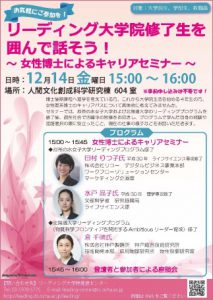 セミナーでは、お茶の水女子大学および北海道大学の博士課程教育リーディングプログラムを修了後、現在社会で活躍中の皆様をお招きし、プログラムで学んだ自身の経験や進路選択の際に役立ったこと、現在の仕事の様子などをお話いただきます。
